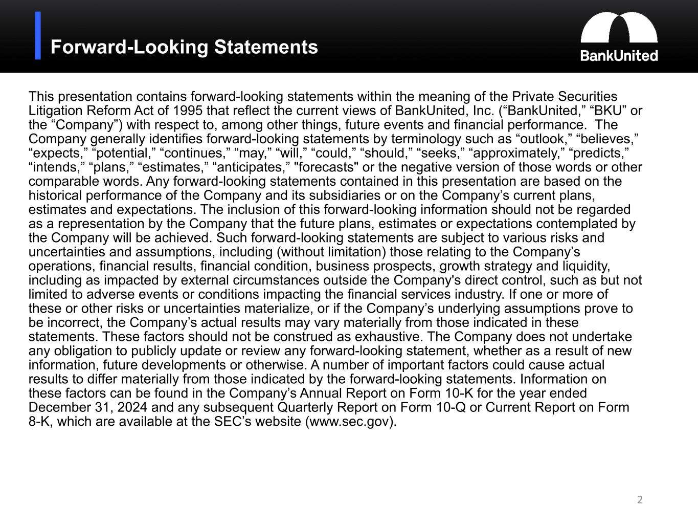 Forward-Looking Statements This presentation contains forward-looking statements within the meaning of the Private Securities Litigation Reform Act of 1995 that reflect the current views of BankUnited, Inc. (“BankUnited,” “BKU” or the “Company”) with respect to, among other things, future events and financial performance. The Company generally identifies forward-looking statements by terminology such as “outlook,” “believes,” “expects,” “potential,” “continues,” “may,” “will,” “could,” “should,” “seeks,” “approximately,” “predicts,” “intends,” “plans,” “estimates,” “anticipates,” "forecasts" or the negative version of those words or other comparable words. Any forward-looking statements contained in this presentation are based on the historical performance of the Company and its subsidiaries or on the Company’s current plans, estimates and expectations. The inclusion of this forward-looking information should not be regarded as a representation by the Company that the future plans, estimates or expectations contemplated by the Company will be achieved. Such forward-looking statements are subject to various risks and uncertainties and assumptions, including (without limitation) those relating to the Company’s operations, financial results, financial condition, business prospects, growth strategy and liquidity, including as impacted by external circumstances outside the Company's direct control, such as but not limited to adverse events or conditions impacting the financial services industry. If one or more of these or other risks or uncertainties materialize, or if the Company’s underlying assumptions prove to be incorrect, the Company’s actual results may vary materially from those indicated in these statements. These factors should not be construed as exhaustive. The Company does not undertake any obligation to publicly update or review any forward-looking statement, whether as a result of new information, future developments or otherwise. A number of important factors could cause actual results to differ materially from those indicated by the forward-looking statements. Information on these factors can be found in the Company’s Annual Report on Form 10-K for the year ended December 31, 2024 and any subsequent Quarterly Report on Form 10-Q or Current Report on Form 8-K, which are available at the SEC’s website (www.sec.gov). 2