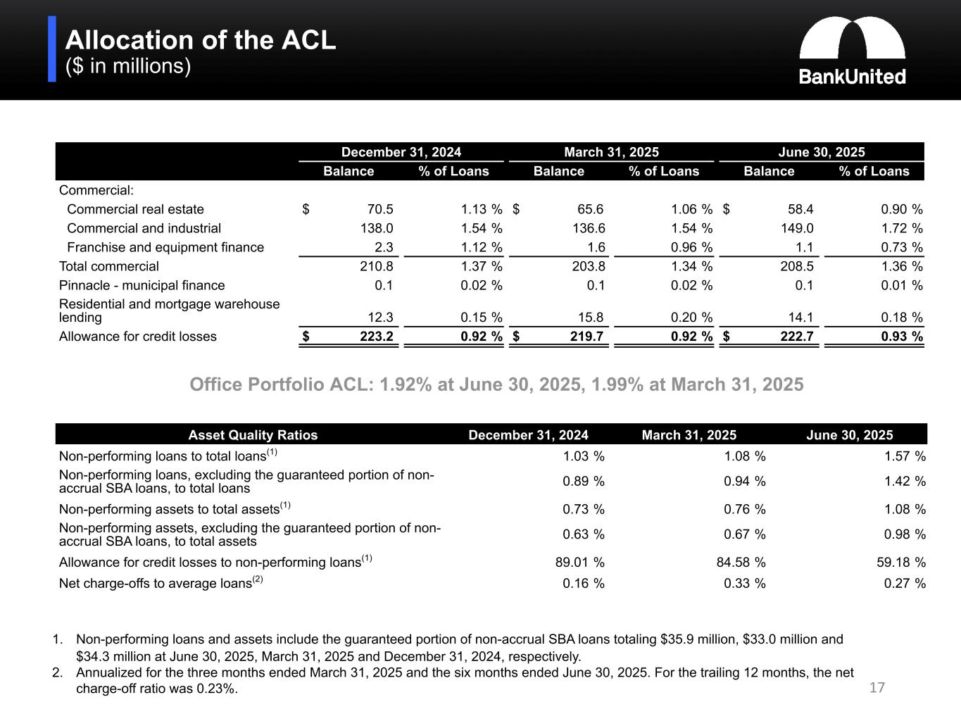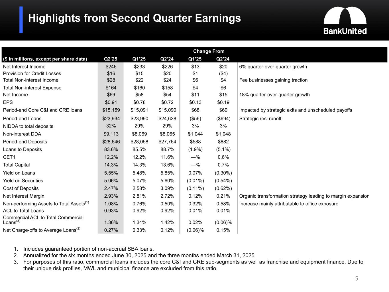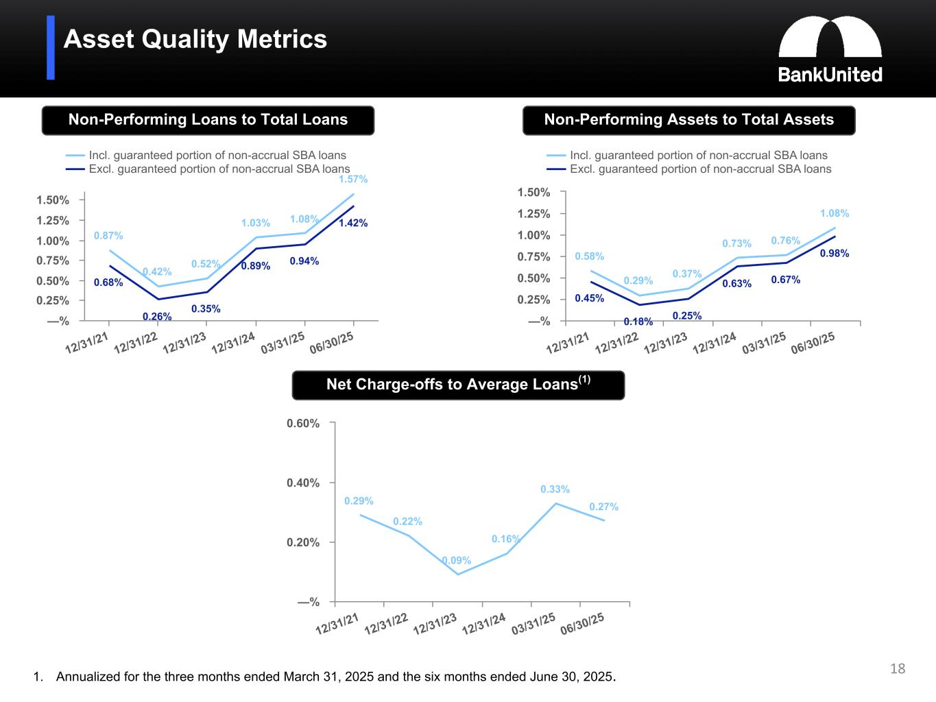 (5) Non-performing loans and assets include the guaranteed portion of non-accrual SBA loans totaling $35.9 million or 0.15% of total loans and 0.10% of total assets at June 30, 2025, $33.0 million or 0.14% of total loans and 0.09% of total assets at March 31, 2025, and $34.3 million or 0.14% of total loans and 0.10% of total assets at December 31, 2024.