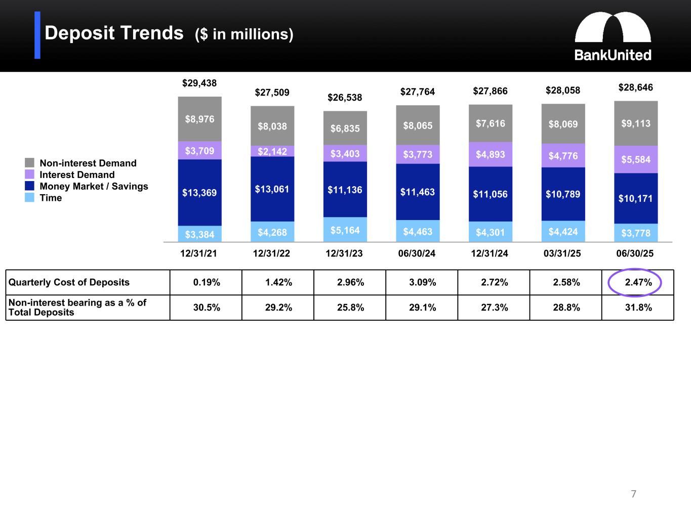 •The Company's funding profile continued to improve this quarter. Non-interest bearing demand deposits ("NIDDA") grew by $1.0 billion, or 13%, to 32% of total deposits, up from 29% at March 31, 2025. NIDDA was also up $1.0 billion compared to June 30, 2024, one year ago. Average NIDDA grew $581 million for the quarter ended June 30, 2025.