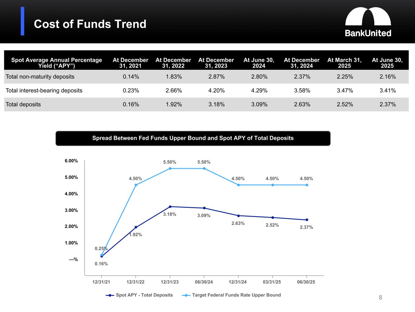 •The average cost of total deposits declined by 0.11% to 2.47% for the quarter ended June 30, 2025 from 2.58% for the immediately preceding quarter ended March 31, 2025. The spot APY of total deposits declined by 0.15% to 2.37% at June 30, 2025 from 2.52% at March 31, 2025. The spot APY of total deposits was 3.09% at June 30, 2024, one year ago.