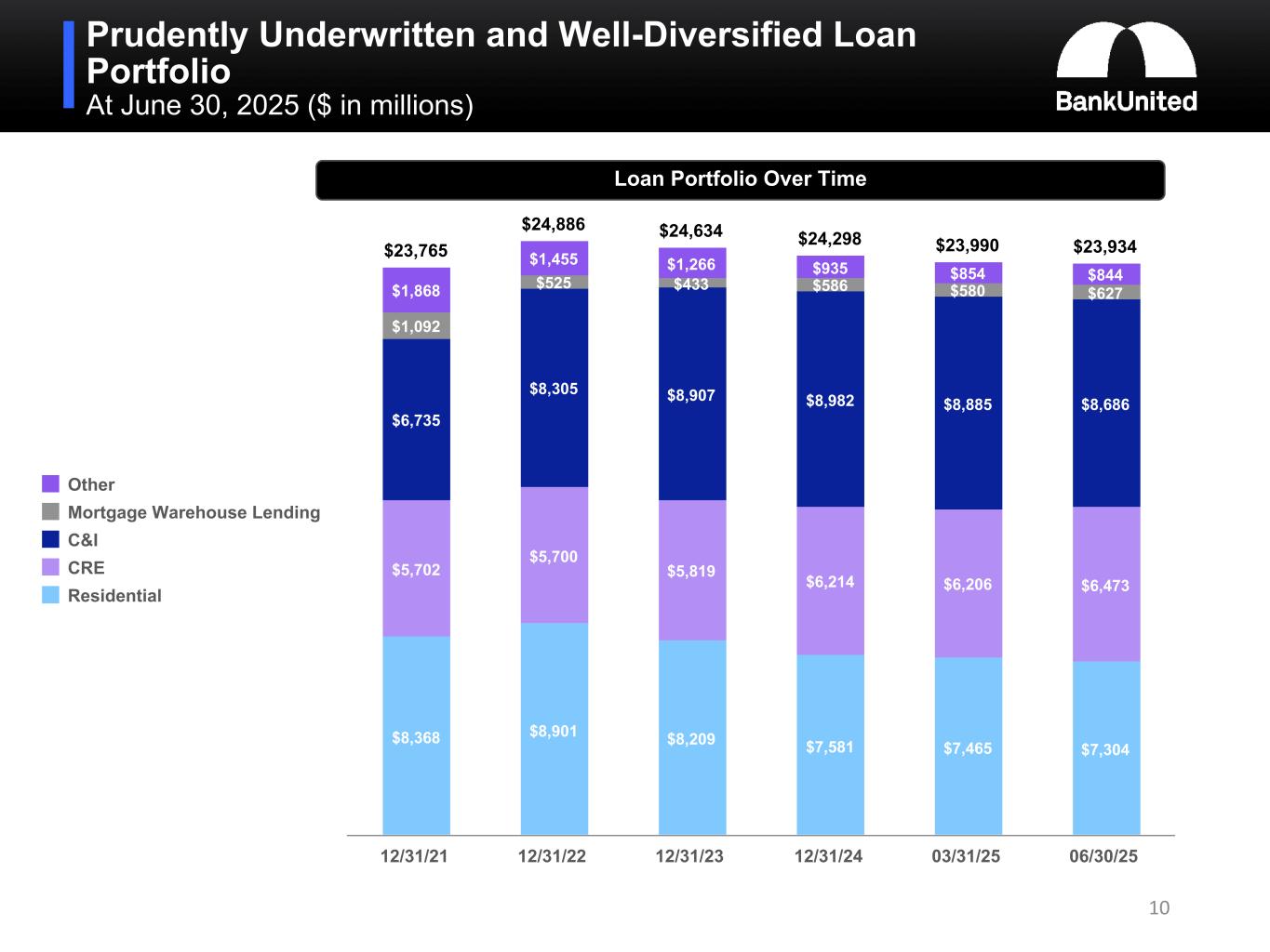 •For the quarter ended June 30, 2025, CRE loans grew by $267 million, largely in line with our expectations. C&I loans declined by $199 million; a continued high level of unscheduled payoffs and some strategic exits impacted C&I growth. Consistent with our balance sheet strategy, the residential, franchise, equipment and municipal finance portfolios declined by a combined $171 million. Total loans declined by $56 million for the quarter ended June 30, 2025.