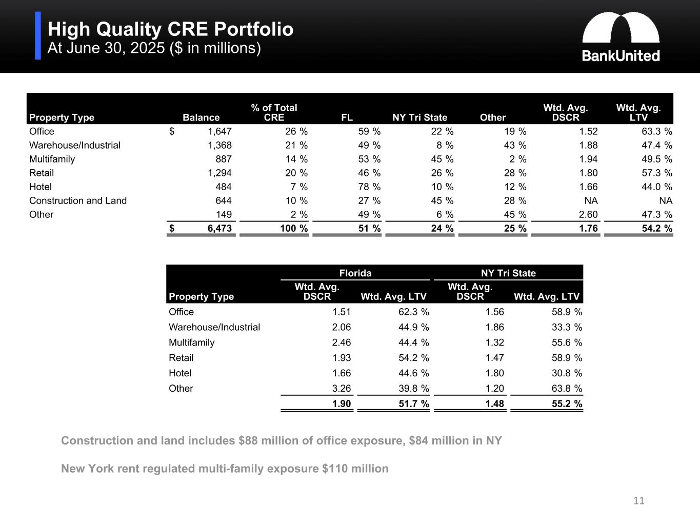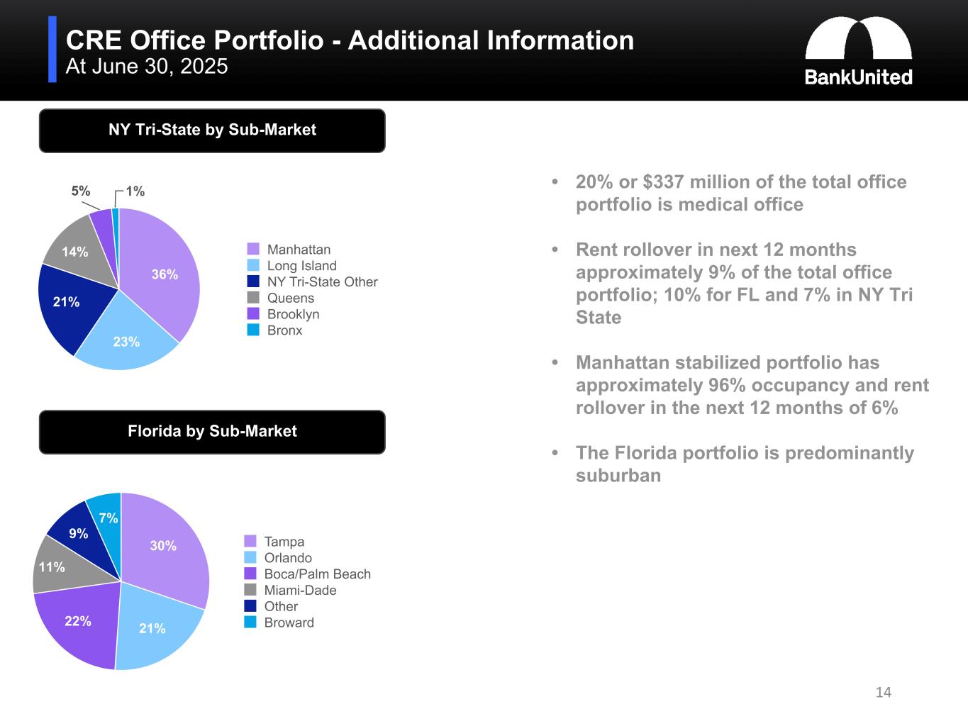 •At June 30, 2025, the weighted average LTV of the CRE portfolio was 54.2%, the weighted average DSCR was 1.76, 51% of the portfolio was collateralized by properties located in Florida and 24% was collateralized by properties located in the New York tri-state area. For the office sub-segment, the weighted average LTV was 63.3%, the weighted average DSCR was 1.52, 59% was collateralized by properties in Florida, substantially all of which was suburban, and 22% was collateralized by properties located in the New York tri-state area.