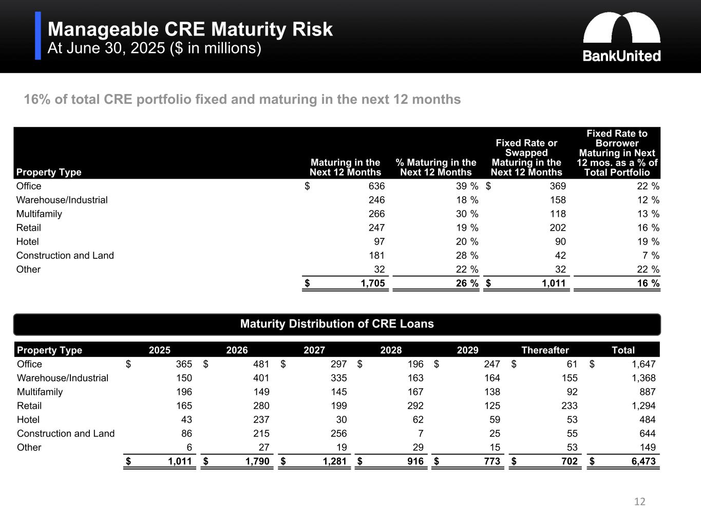 High Quality CRE Portfolio At June 30, 2025 ($ in millions) Property Type Balance % of Total CRE FL NY Tri State Other Wtd. Avg. DSCR Wtd. Avg. LTV Office $ 1,647 26 % 59 % 22 % 19 % 1.52 63.3 % Warehouse/Industrial 1,368 21 % 49 % 8 % 43 % 1.88 47.4 % Multifamily 887 14 % 53 % 45 % 2 % 1.94 49.5 % Retail 1,294 20 % 46 % 26 % 28 % 1.80 57.3 % Hotel 484 7 % 78 % 10 % 12 % 1.66 44.0 % Construction and Land 644 10 % 27 % 45 % 28 % NA NA Other 149 2 % 49 % 6 % 45 % 2.60 47.3 % $ 6,473 100 % 51 % 24 % 25 % 1.76 54.2 % 11 Florida NY Tri State Property Type Wtd. Avg. DSCR Wtd. Avg. LTV Wtd. Avg. DSCR Wtd. Avg. LTV Office 1.51 62.3 % 1.56 58.9 % Warehouse/Industrial 2.06 44.9 % 1.86 33.3 % Multifamily 2.46 44.4 % 1.32 55.6 % Retail 1.93 54.2 % 1.47 58.9 % Hotel 1.66 44.6 % 1.80 30.8 % Other 3.26 39.8 % 1.20 63.8 % 1.90 51.7 % 1.48 55.2 % Construction and land includes $88 million of office exposure, $84 million in NY New York rent regulated multi-family exposure $110 million