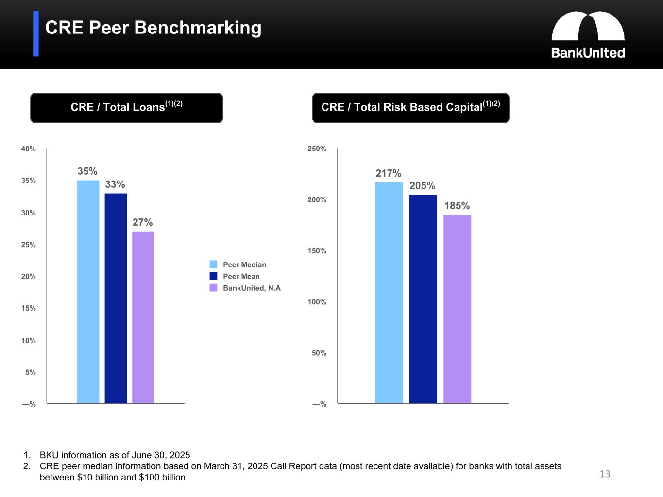 Our commercial real estate exposure totaled 27% of loans and 185% of the Bank's total risk based capital at June 30, 2025. By comparison, based on call report data as of March 31, 2025 for banks with between $10 billion and $100 billion in assets, the median level of CRE to total loans was 35% and the median level of CRE to total risk based capital was 217%.