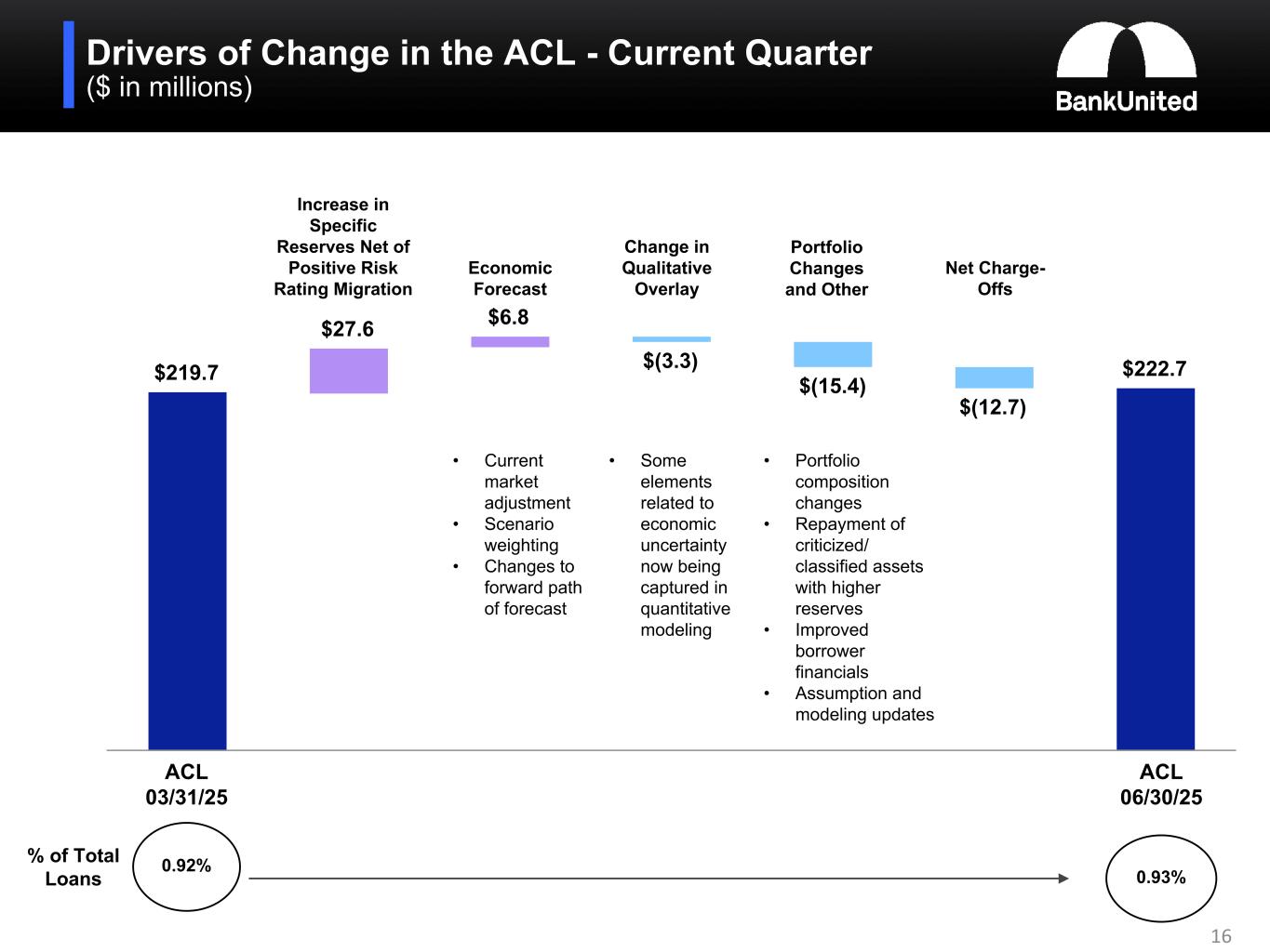 The ACL at June 30, 2025 represents management's estimate of lifetime expected credit losses, or the amount of amortized cost not expected to be collected, given an assessment of historical data, current conditions, and a reasonable and supportable economic forecast as of the balance sheet date. For the quarter ended June 30, 2025, the provision for credit losses, including portions related to both funded and unfunded loan commitments, was $15.7 million, compared to $15.1 million for the immediately preceding quarter ended March 31, 2025 and $19.5 million for the quarter ended June 30, 2024. Factors impacting the provision for credit losses and increase in the ACL for the quarter included increases in specific reserves and deterioration in the economic forecast, substantially offset by the impact of upgrades and payoffs of criticized and classified commercial loans, some reduction in certain qualitative factors and net charge-offs. The quarter-over-quarter decline in the ratio of the ACL to non-performing loans is related to non-performing loans that have no or relatively low related ACL due to the adequacy of estimated collateral value to cover the remaining outstanding balance, which is in some cases net of partial charge-offs recognized.
