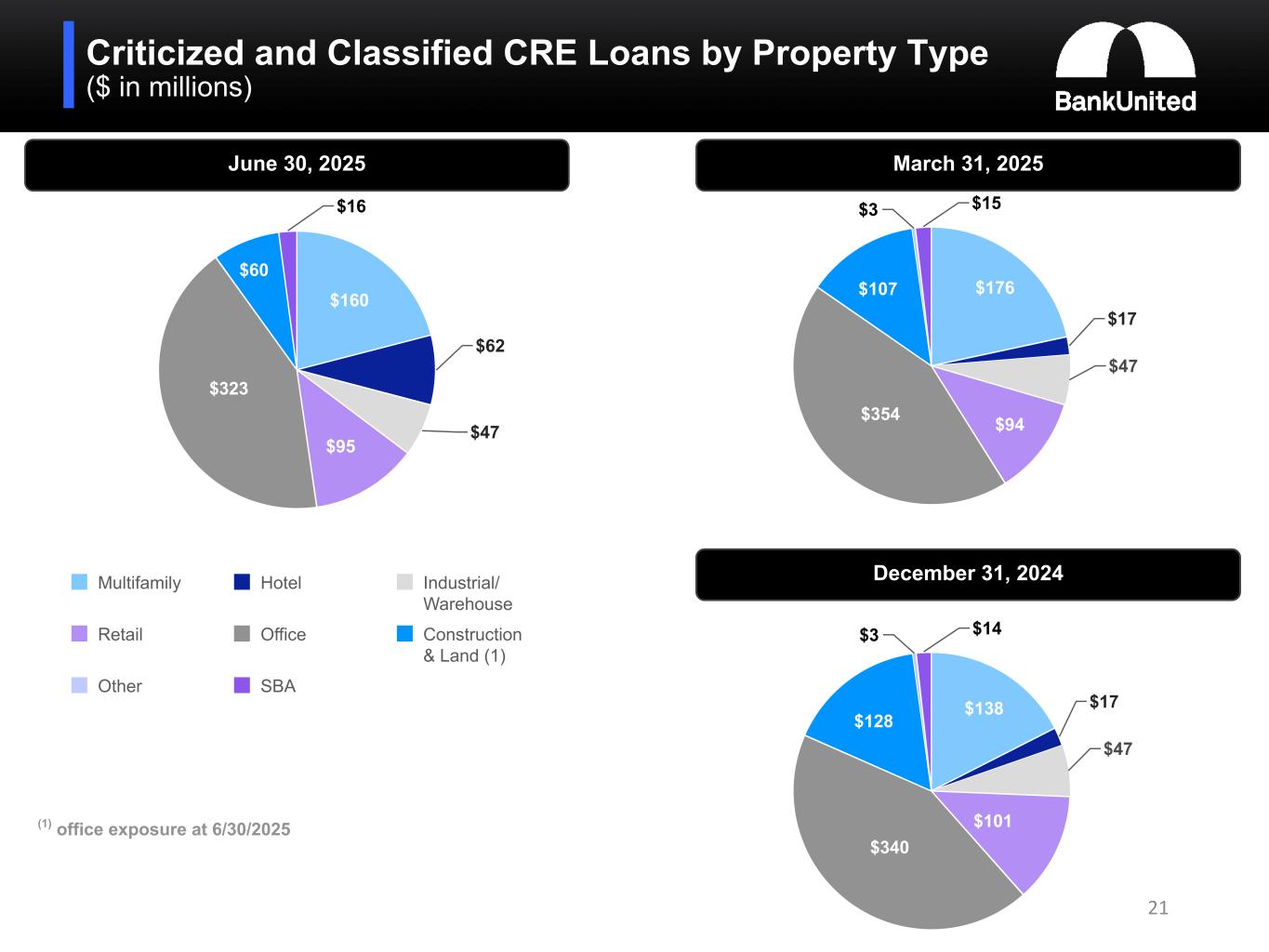 Criticized and Classified Loans ($ in millions) 20 Commercial Real Estate(1) Commercial(1)(2) Special Mention Substandard Accruing Substandard Non-accruing and Doubtful 12/31/21 12/31/2022 12/31/23 12/31/24 03/31/25 06/30/25 $— $100 $200 $300 $400 $500 $600 $700 $800 $900 $1,000 12/31/21 12/31/2022 12/31/23 12/31/24 03/31/25 06/30/25 $— $100 $200 $300 $400 $500 $600 $700 $800 $900 $1,000 1. Excludes SBA 2. Includes C&I and franchise and equipment finance