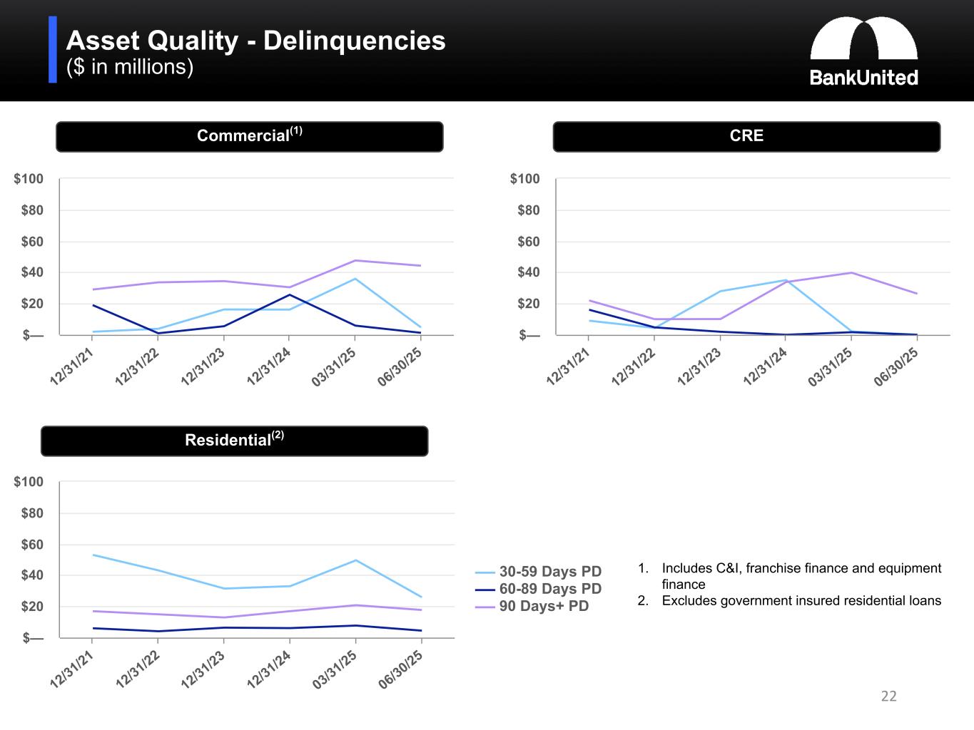 Criticized and Classified CRE Loans by Property Type ($ in millions) 21 December 31, 2024 $138 $17 $47 $101 $340 $128 $3 $14 $160 $62 $47 $95 $323 $60 $16 Multifamily Hotel Industrial/ Warehouse Retail Office Construction & Land (1) Other SBA June 30, 2025 (1) office exposure at 6/30/2025 March 31, 2025 $176 $17 $47 $94$354 $107 $3 $15