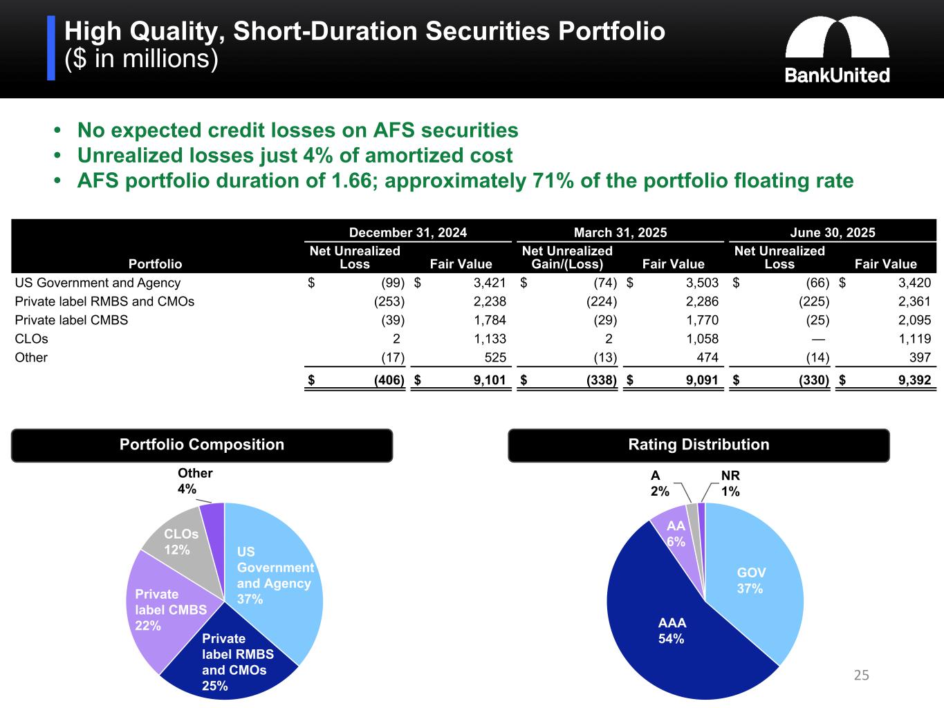 High Quality, Short-Duration Securities Portfolio ($ in millions) December 31, 2024 March 31, 2025 June 30, 2025 Portfolio Net Unrealized Loss Fair Value Net Unrealized Gain/(Loss) Fair Value Net Unrealized Loss Fair Value US Government and Agency $ (99) $ 3,421 $ (74) $ 3,503 $ (66) $ 3,420 Private label RMBS and CMOs (253) 2,238 (224) 2,286 (225) 2,361 Private label CMBS (39) 1,784 (29) 1,770 (25) 2,095 CLOs 2 1,133 2 1,058 — 1,119 Other (17) 525 (13) 474 (14) 397 $ (406) $ 9,101 $ (338) $ 9,091 $ (330) $ 9,392 Portfolio Composition US Government and Agency 37% Private label RMBS and CMOs 25% Private label CMBS 22% CLOs 12% Other 4% Rating Distribution GOV 37% AAA 54% AA 6% A 2% NR 1% • No expected credit losses on AFS securities • Unrealized losses just 4% of amortized cost • AFS portfolio duration of 1.66; approximately 71% of the portfolio floating rate 25