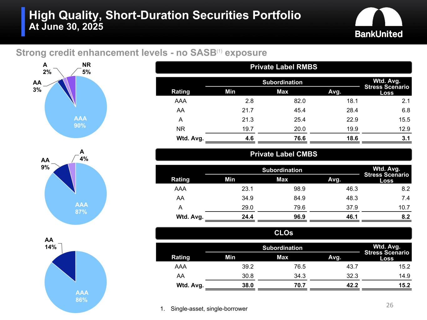 High Quality, Short-Duration Securities Portfolio At June 30, 2025 Strong credit enhancement levels - no SASB(1) exposure Private Label RMBS Subordination Wtd. Avg. Stress Scenario LossRating Min Max Avg. AAA 2.8 82.0 18.1 2.1 AA 21.7 45.4 28.4 6.8 A 21.3 25.4 22.9 15.5 NR 19.7 20.0 19.9 12.9 Wtd. Avg. 4.6 76.6 18.6 3.1 Private Label CMBS Subordination Wtd. Avg. Stress Scenario LossRating Min Max Avg. AAA 23.1 98.9 46.3 8.2 AA 34.9 84.9 48.3 7.4 A 29.0 79.6 37.9 10.7 Wtd. Avg. 24.4 96.9 46.1 8.2 CLOs Subordination Wtd. Avg. Stress Scenario LossRating Min Max Avg. AAA 39.2 76.5 43.7 15.2 AA 30.8 34.3 32.3 14.9 Wtd. Avg. 38.0 70.7 42.2 15.2 AAA 90% AA 3% A 2% NR 5% AAA 87% AA 9% A 4% AAA 86% AA 14% 261. Single-asset, single-borrower